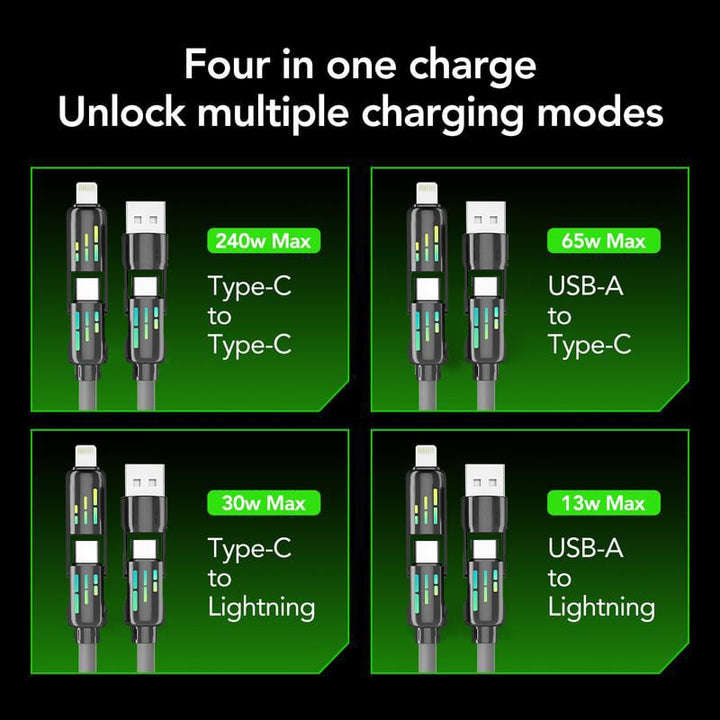 🔌 4-in-1 Design: Features 4 plugs: USB A, Lightning, and Double Type-C, offering versatility for various devices.